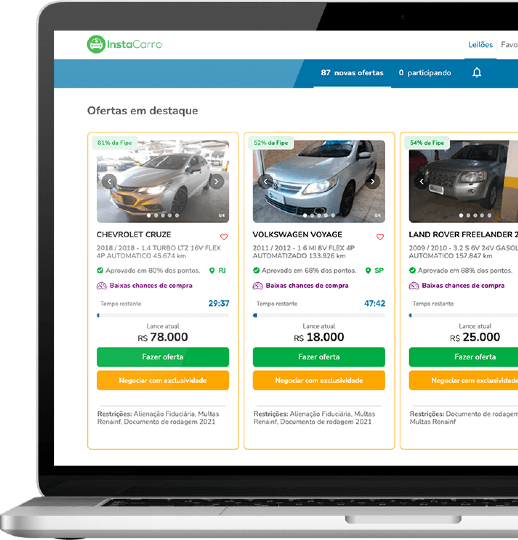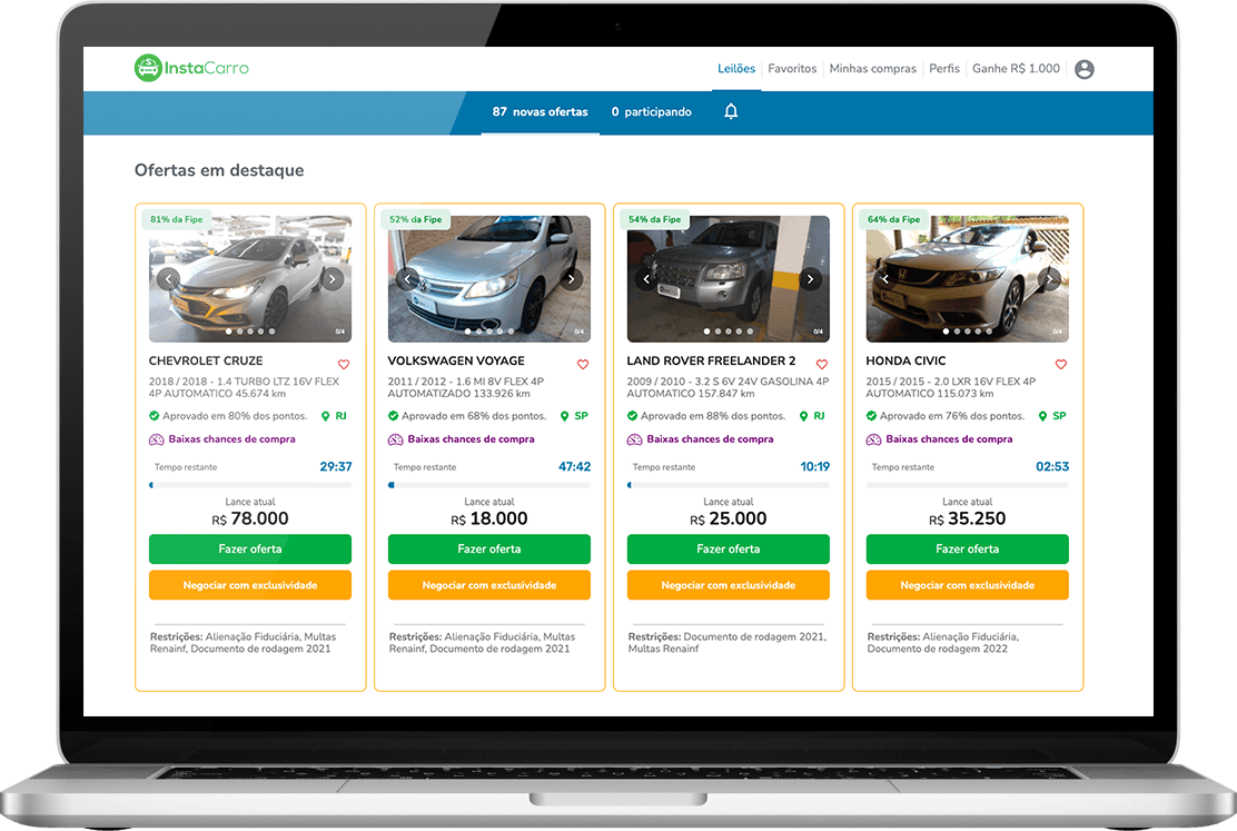 Faça lances, negocie e feche a compra direto pelo computador ou aplicativo, sem deslocamento.